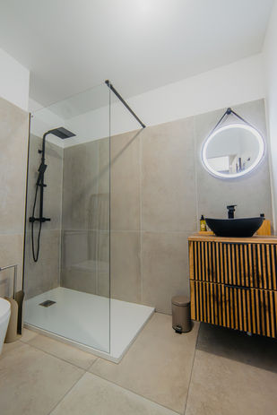 L’espace comprend également une kitchenette entièrement équipée, idéale pour préparer un repas en toute simplicité. La chambre principale est un véritable havre de paix, dotée d’un lit king-size ultra-confortable et d’un jacuzzi privatif, parfait pour se détendre après une journée de découverte. Pour parfaire cette ambiance cocooning, une cheminée électrique fonctionnelle diffuse une chaleur douce, créant une atmosphère apaisante et romantique.